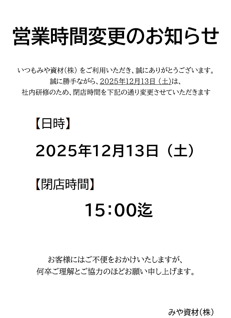 社内研修のため、閉店時間を下記の通り変更させていただきます。